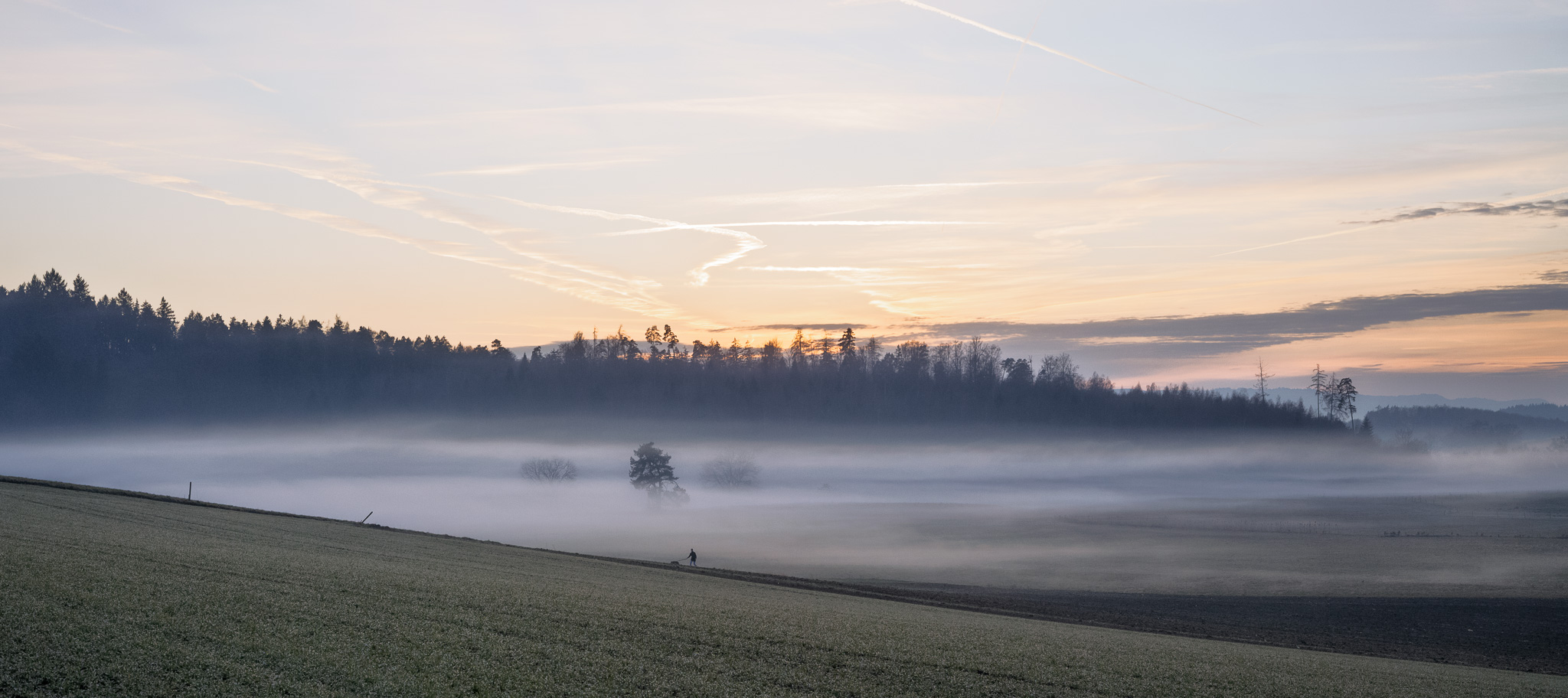 Es ist selten, aber manchmal kommen mehrere Situationen zusammen, wenn man zur richtigen Zeit am richtigen Ort ist - Sonnenuntergang, Nebelschwaden zwischen den feuchten Endmoränensenken, ein Spaziergänger mit Hund. Leica M11 mit Voigtländer APO-Lanthar 35mm F2