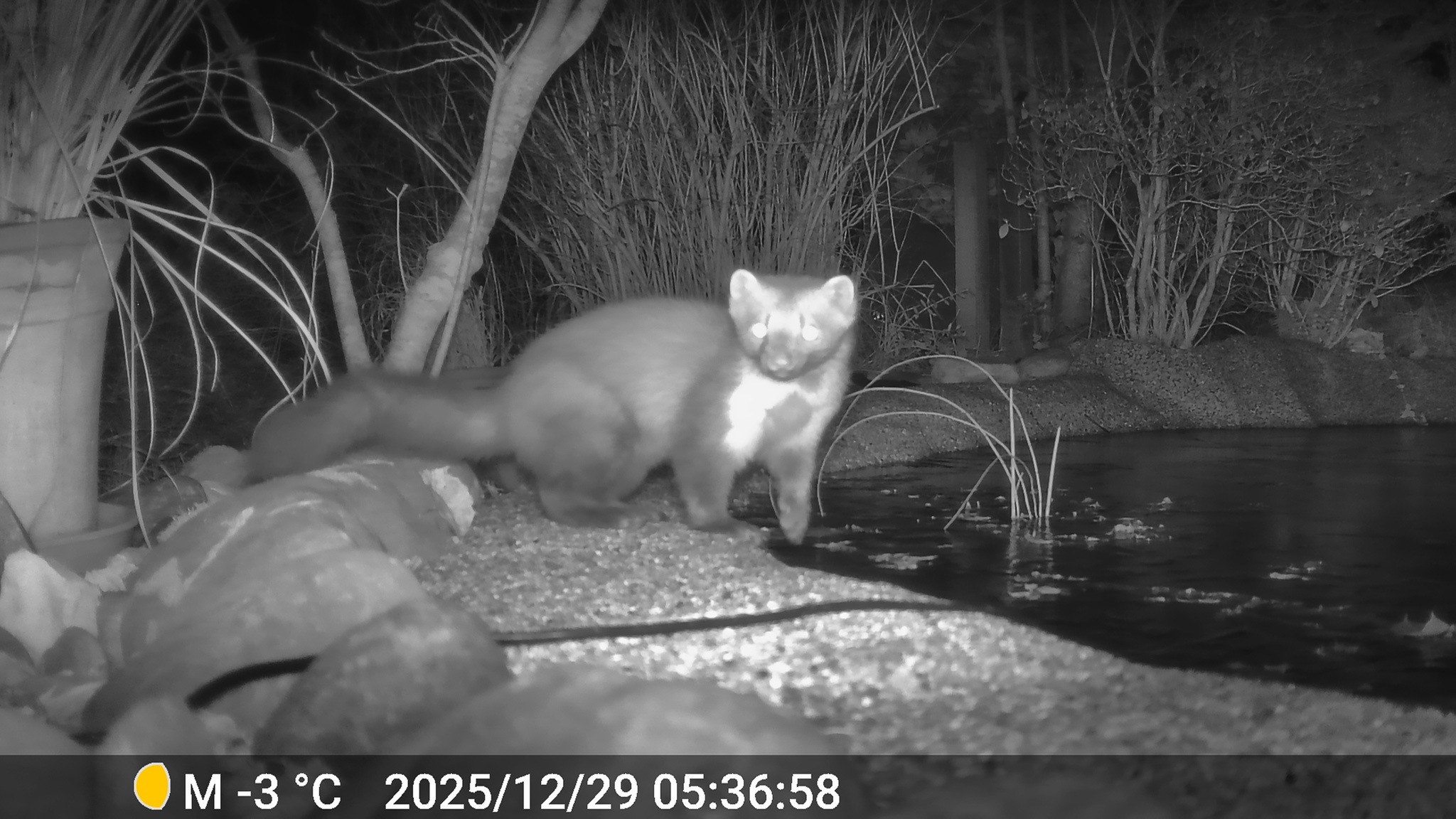 Dass wir einen Marder entweder im Garten oder irgendwo in der Nähe haben, habe ich schon öfter auf den Bildern meiner Wildtierkamera gesehen. Als ich diese heute mal wieder reingeholt und die Fotos angeschaut habe, waren überraschend viele Fotos, auf denen er zu sehen war, dabei. Hier ein besonders schönes: Und so konnte ich auch feststellen, dass es mittlerweile sogar zwei MArder sind: ...