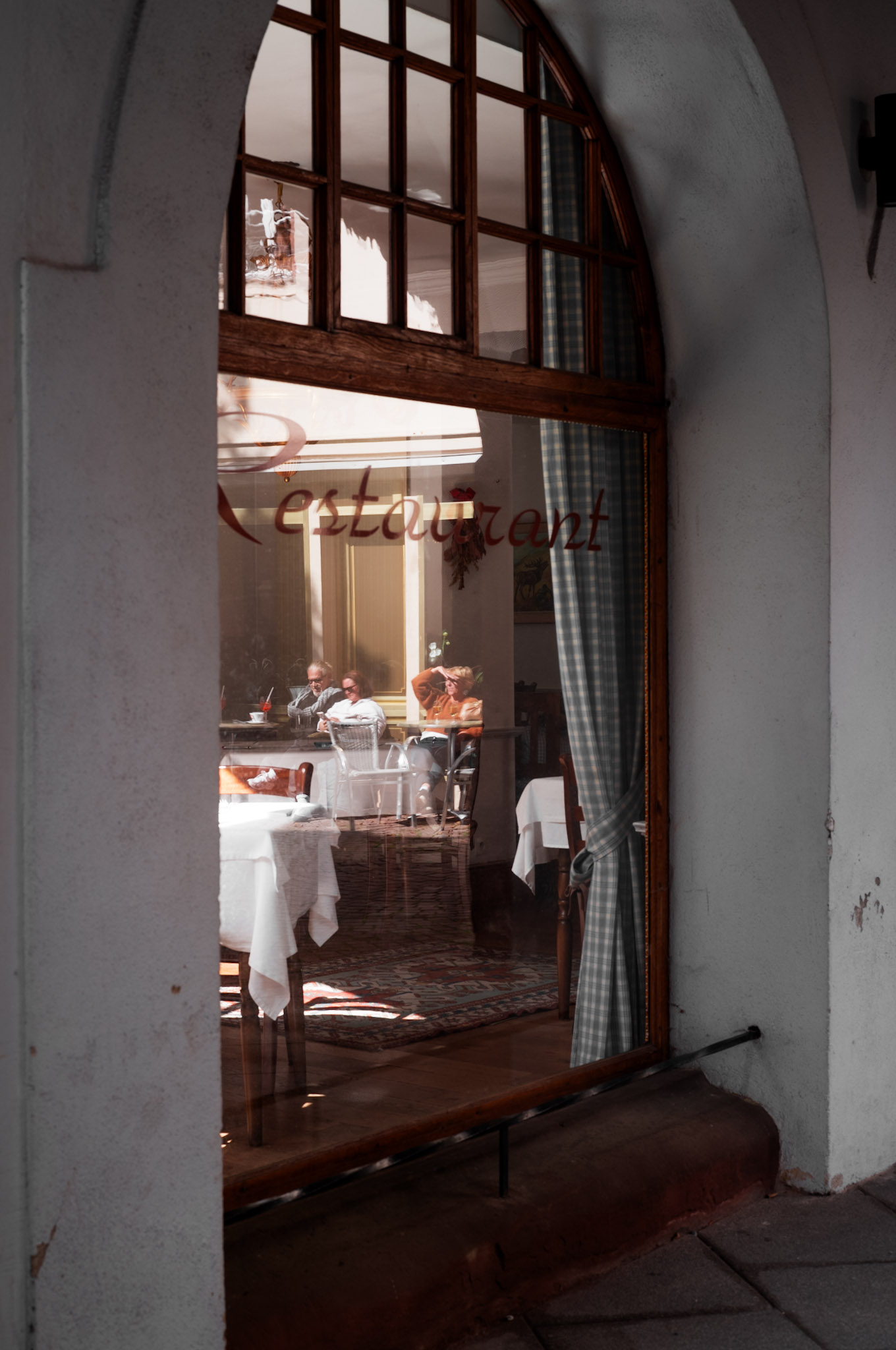 Blick durch ein Fenster auf einen Tisch für 3 Personen in einem Restaurant in Colmar.